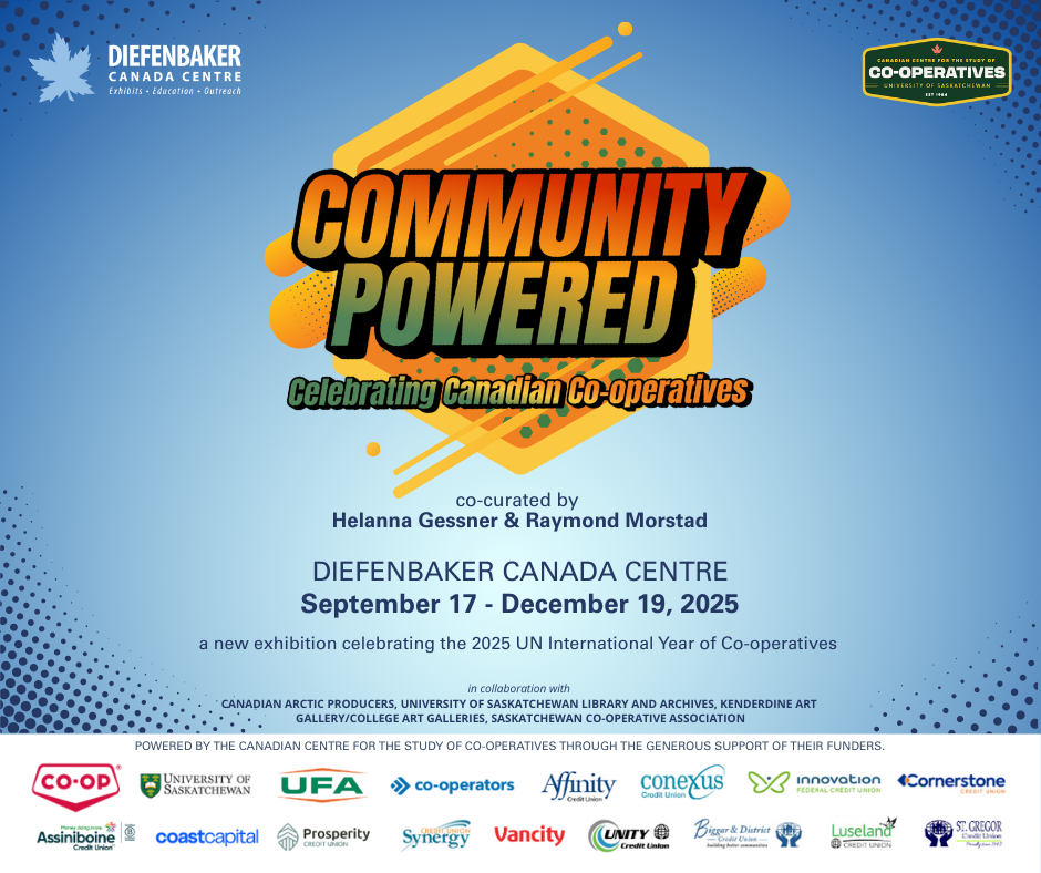 Community Powered: Celebrating Canadian Co-operatives is presented by the Diefenbaker Canada Centre in partnership with the Canadian Centre for the Study of Co-operatives, and in collaboration with Canadian Arctic Producers, University of Saskatchewan Library and Archives, Kenderdine Art Gallery/College Art Galleries, and Saskatchewan Co-operative Association. Special thanks to the CCSC’s funders for making this exhibit possible.